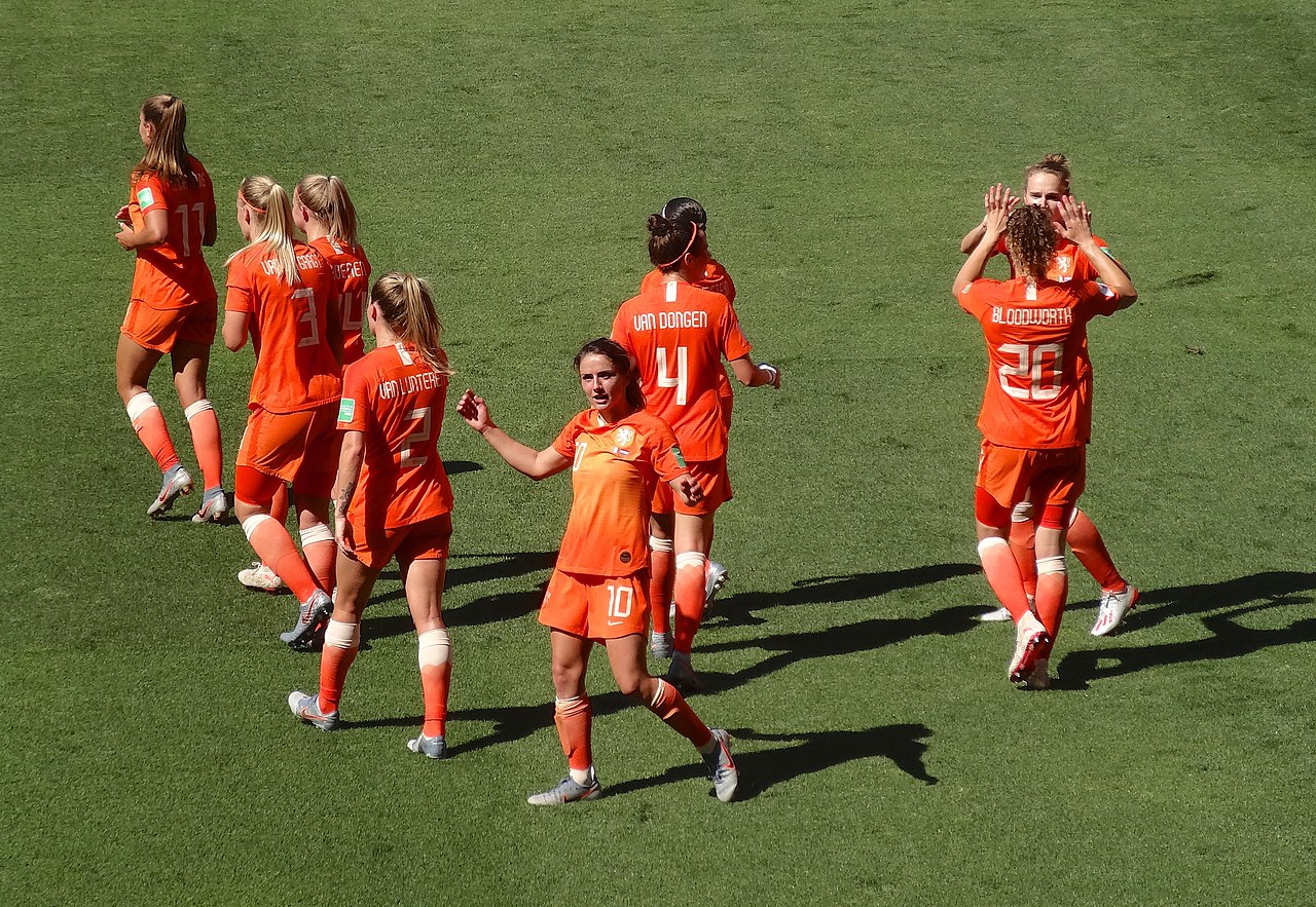 Esultanza delle olandesi nel mondiale del 2019 (cr. Liondartois Wikimedia commons)