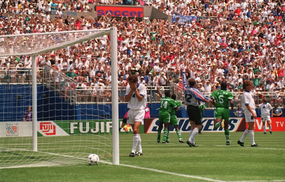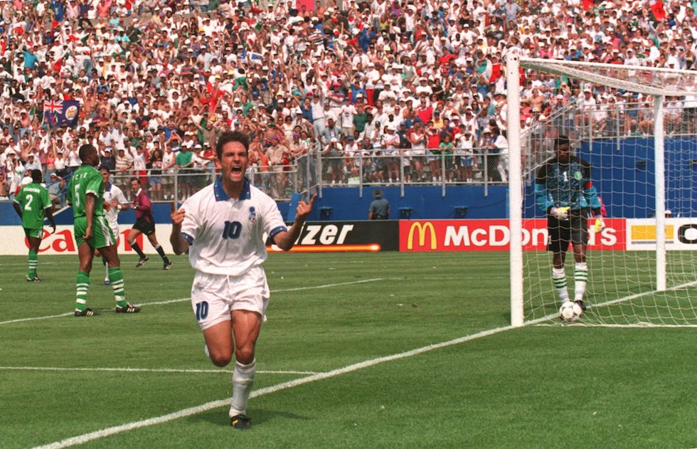 Prima di andare a un terzo motivo per cui vale la pena ricordare Usa 94 bisogna lasciare un po’ di spazio alla cronaca spicciola. L’Italia di Sacchi parte malissimo nel girone iniziale qualificandosi solo al ripescaggio fra le terze; agli ottavi le tocca la Nigeria, squadra rivelazione forte di calciatori fisicamente superiori. In svantaggio, l’Italia non ritrova il bandolo della matassa e nel finale subisce anche l’umiliazione dei nigeriani che fanno melina. Con la testa sembrano tutti sulla via di casa ma fra di loro c’è uno, Roberto Baggio, che a due minuti dalla fine ci crede ancora e centra un tiro al veleno e la infila nell’angolino a destra del portiere africano. Roba di un centimetro e l’Italia è viva.