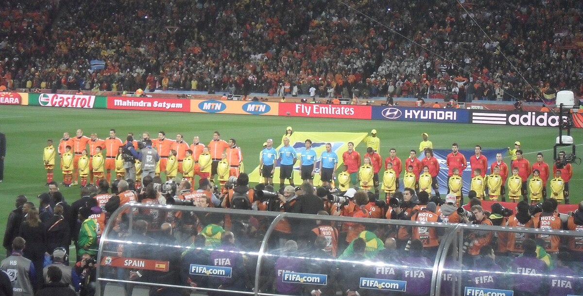 Spagna e Olanda schierate prima della finale (cr. Christophe Badoux Wikimedia commons)