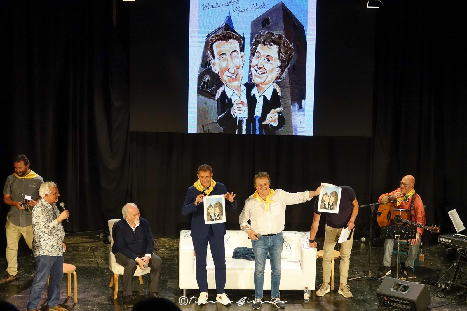 Ezio Greggio ed Enzo Iachetti disegnati da Moretti, con loro Antonio Ricci, per il premio Fionda di legno (foto fornita dall'organizzazione)