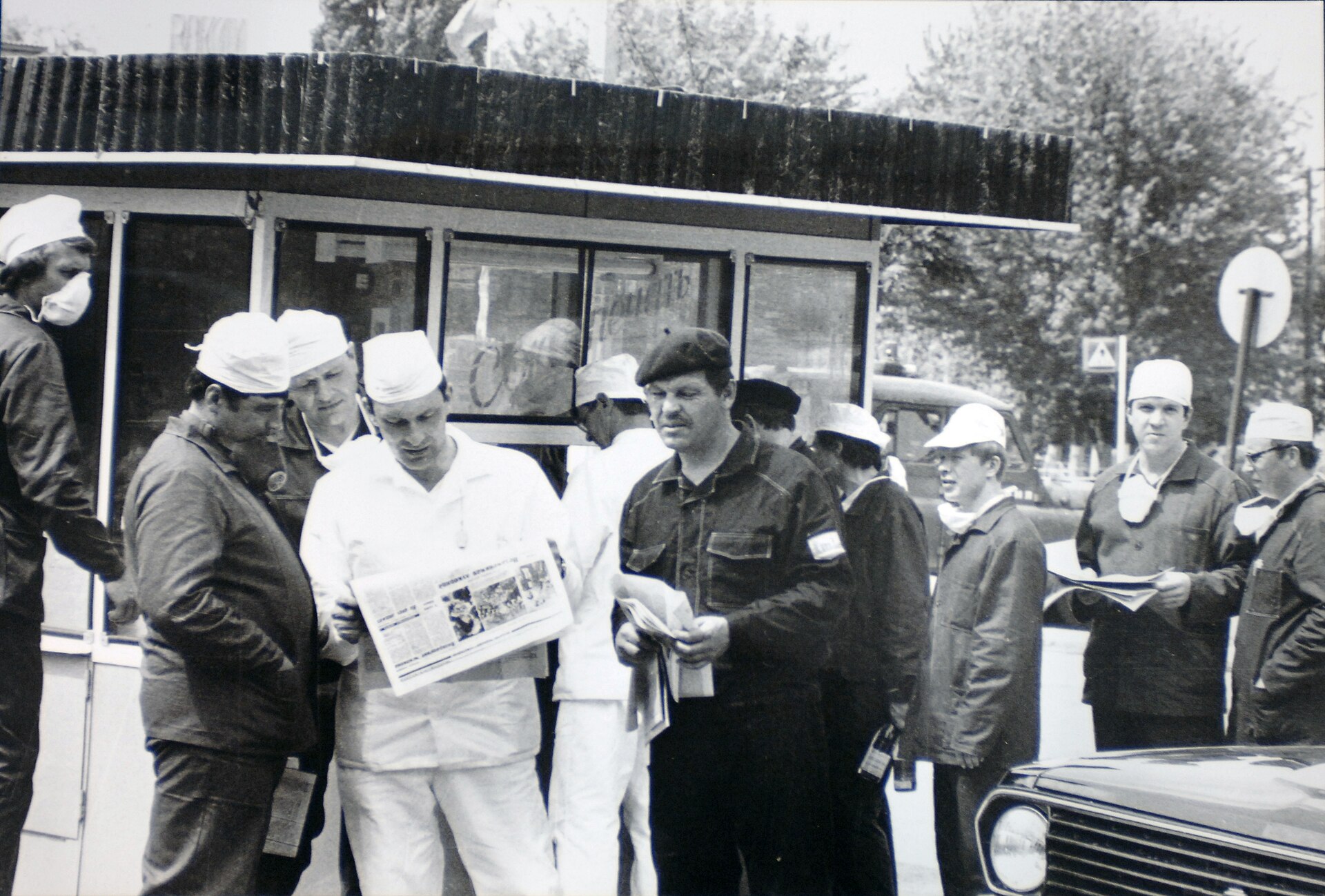 I lavoratori della zona cercano informazioni sui giornali sovietici (cr. IAEA Wikimedia commons)