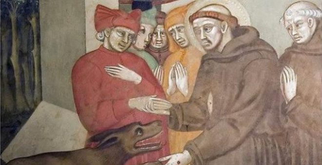 Cristoforo di Bindoccio e Meo di Piero, "Francesco e il lupo", chiesa di San Francesco a Pienza