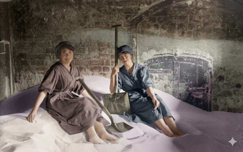 Foto colorata di operaie in una raffineria di zucchero in Inghilterra (cr. G.P. Lewis, 1918 Wikimedia commons)