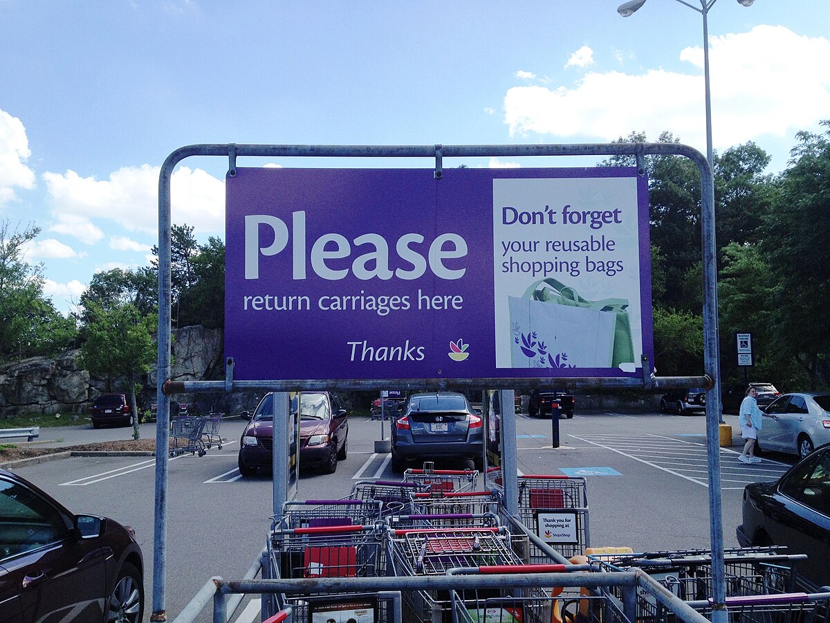 Un cartello che invita a non abbandonare i carrelli (cr. ReturnJ Wikimedia commons)