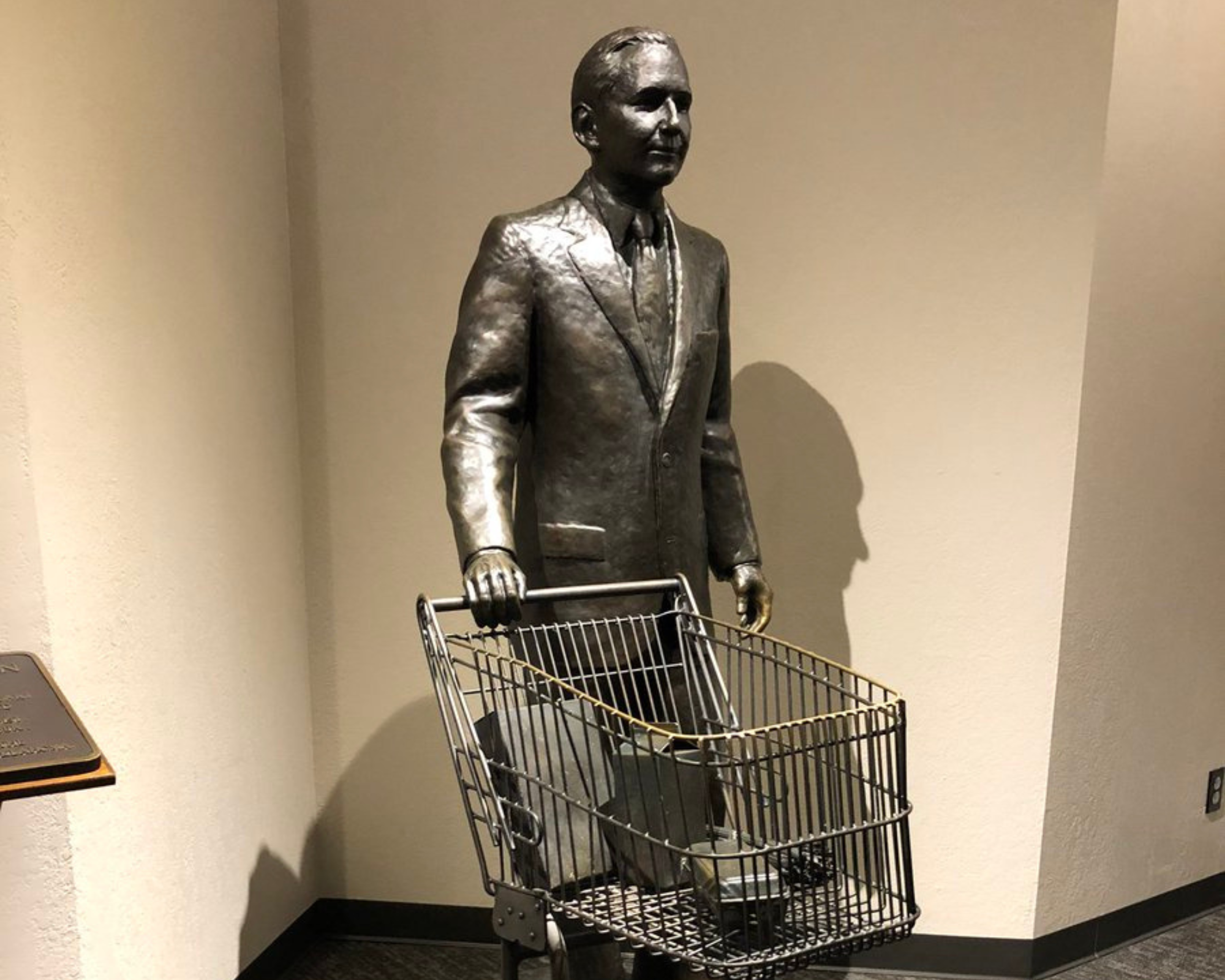 Scultura dedicata a Sylvan Goldman, inventore del carrello (da X Zenzele)