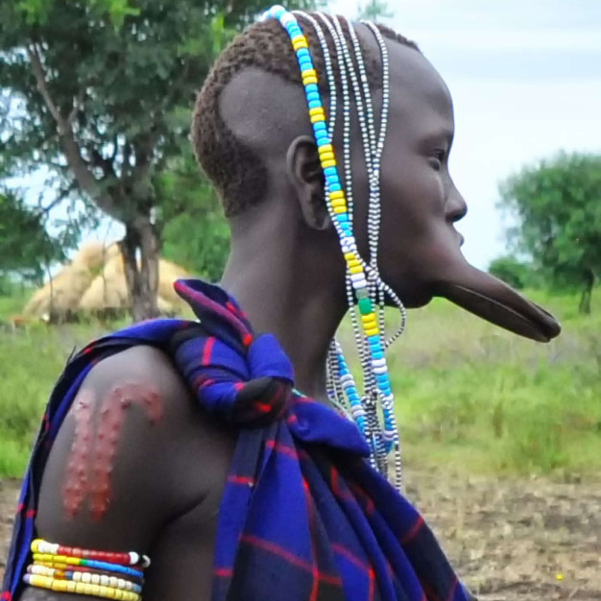 Donna della tribù Mursi con il labbro deformato da un disco (cr. Rod Waddington Wikimedia commons)