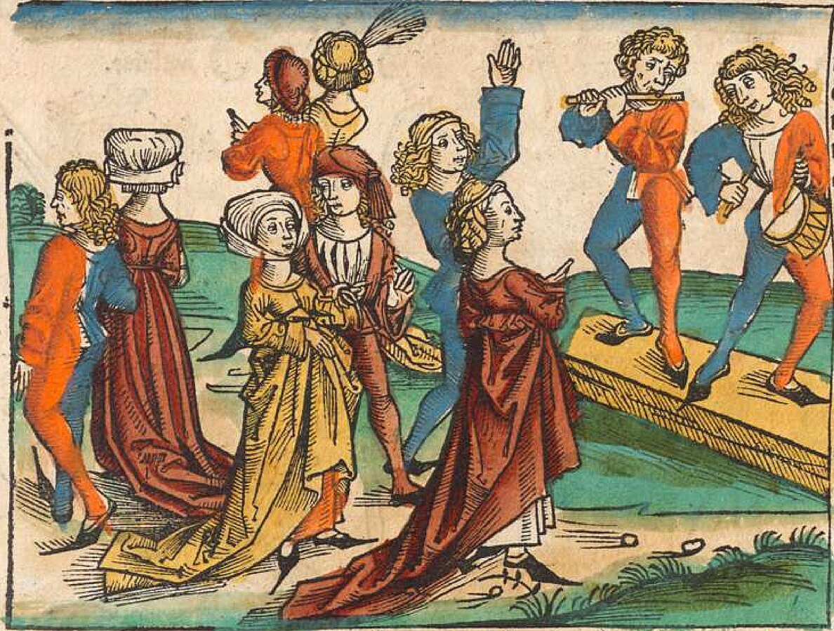 Balli di coppia dalle Cronache di Norimberga, 1493 (cr. Wogelmutt e Pleydenwurff Wikimedia commons)