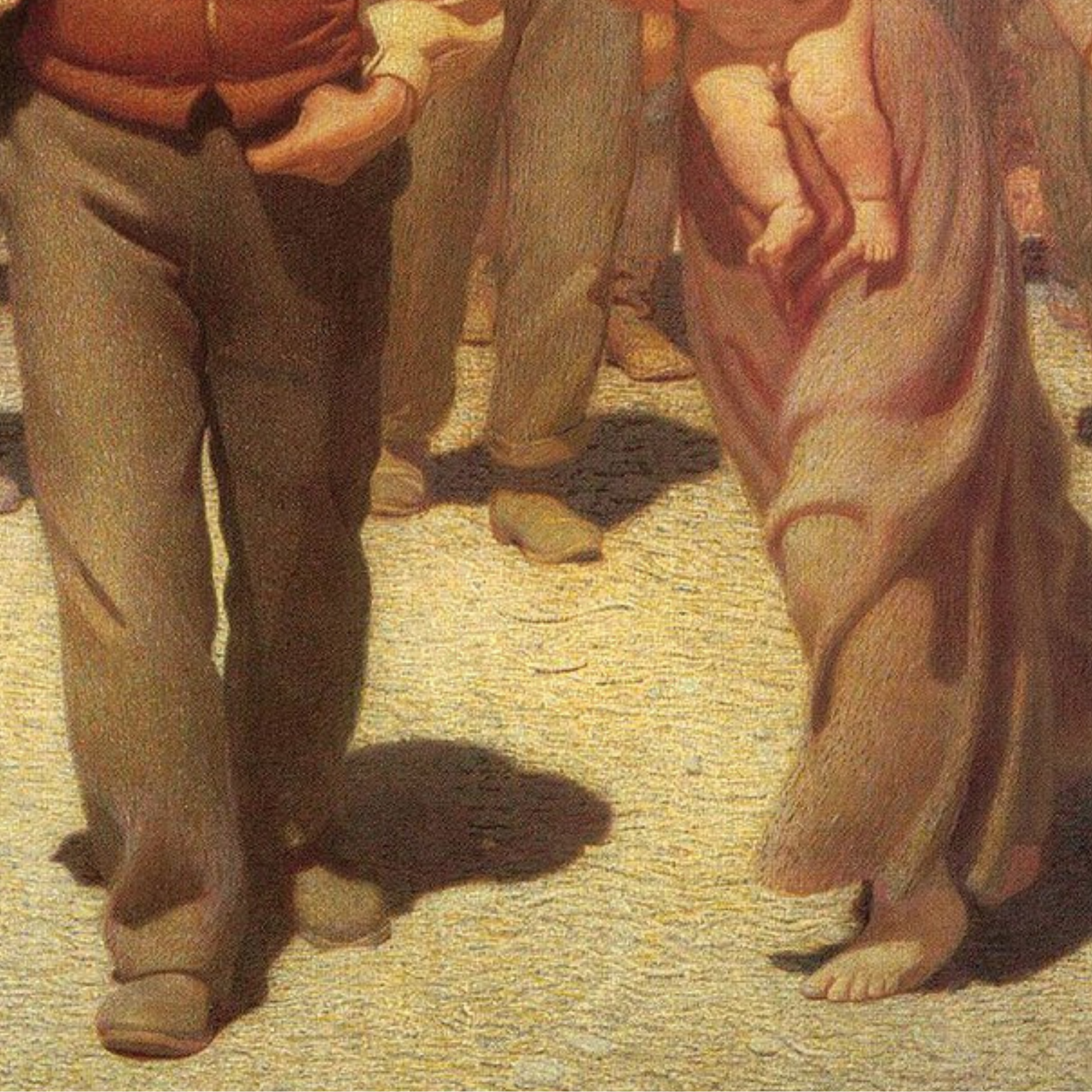 I piedi nudi di Teresa di fianco all’uomo che le scarpe le ha, forse alludono anche a questa povertà nella povertà o alludono alla situazione di minorità anche giuridica che la donna ha avuto dall’antichità fino al XX secolo, se notiamo che nel quadro - per dare un’altra occhiata inesperta, ma non distratta - altri personaggi senza scarpe sono bambini.