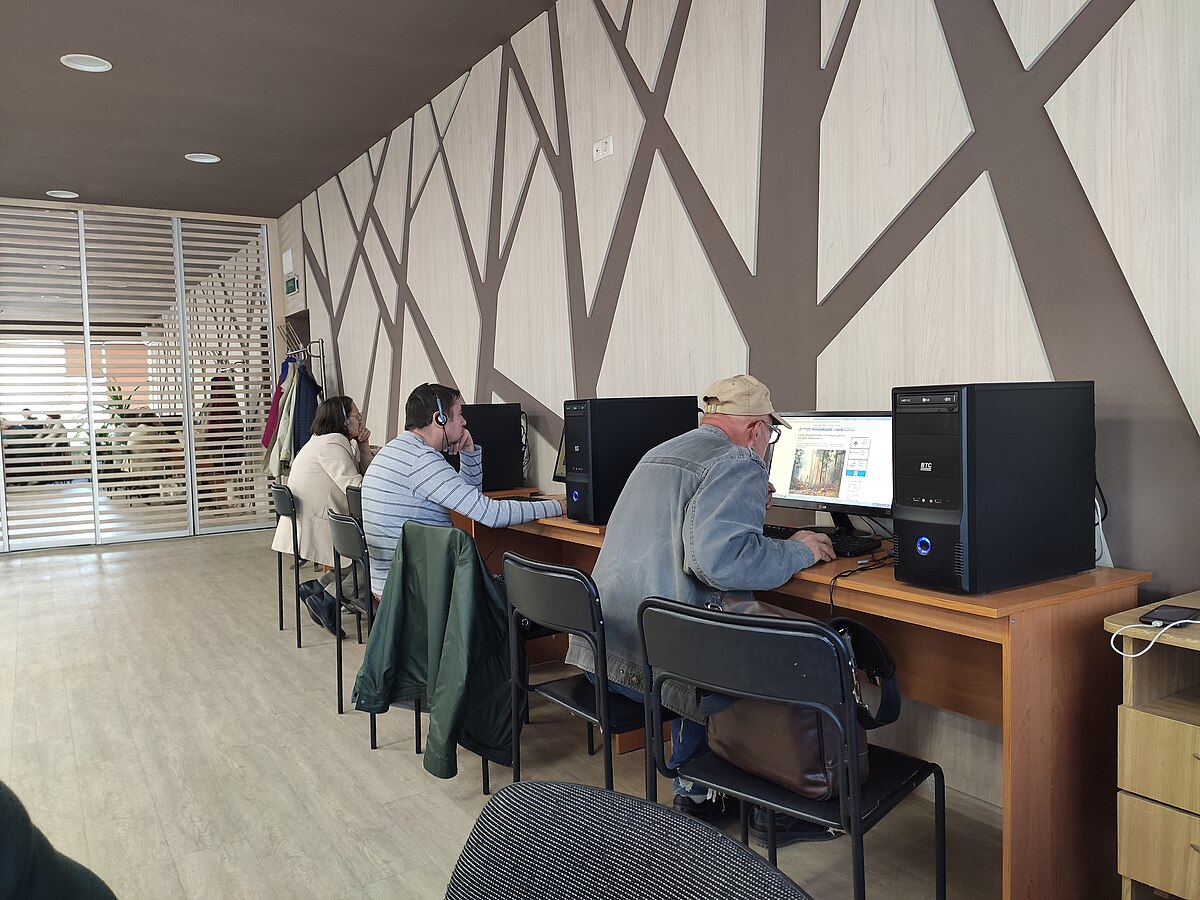 Adulti al computer nella biblioteca di Moskovsky, in Ucraina, prima della guerra (cr. Evgenia Kulyk Wikimedia commons)