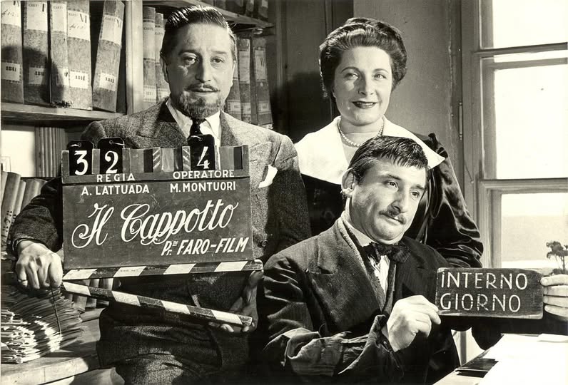 Un fuori scena durante le riprese de "Il cappotto" di Lattuada, 1952