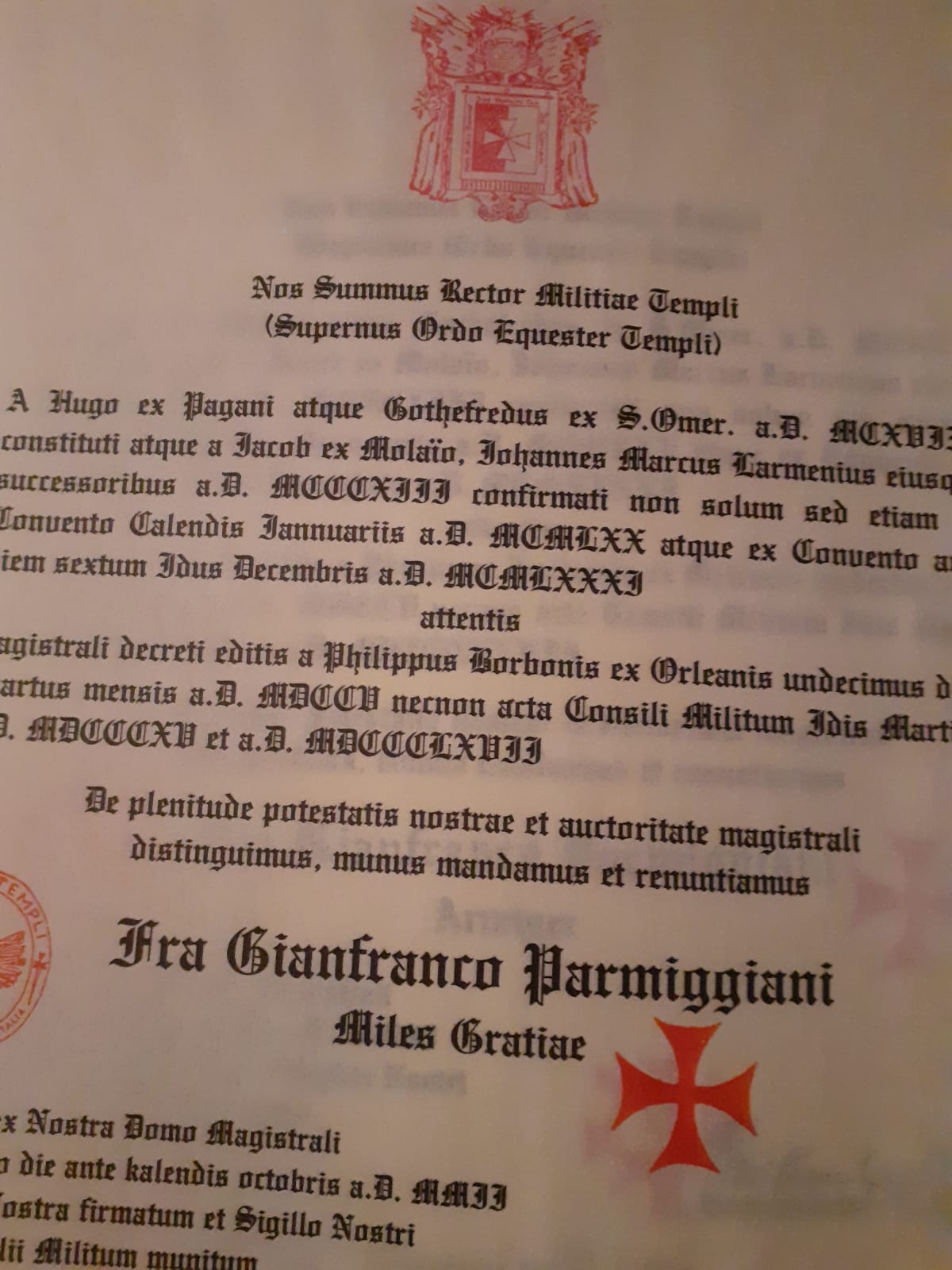 L'attestato di nomina a Cavaliere Templare dell'autore di questo articolo