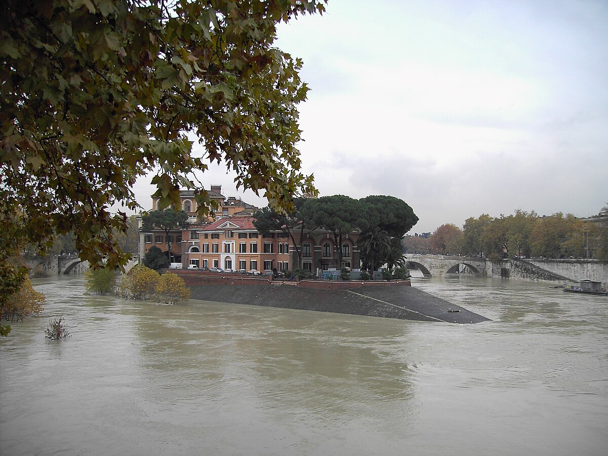 L'isola Tiberina durante la piena del 2005 (cr. Lalupa Wikimedia commons)