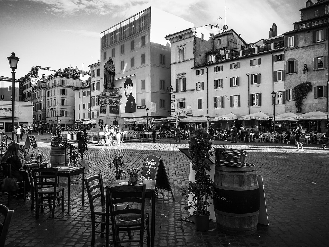 Immagine in bianco e nero di Campo de' Fiori (cr. F. Tamburini 75 Wikimedia commons)