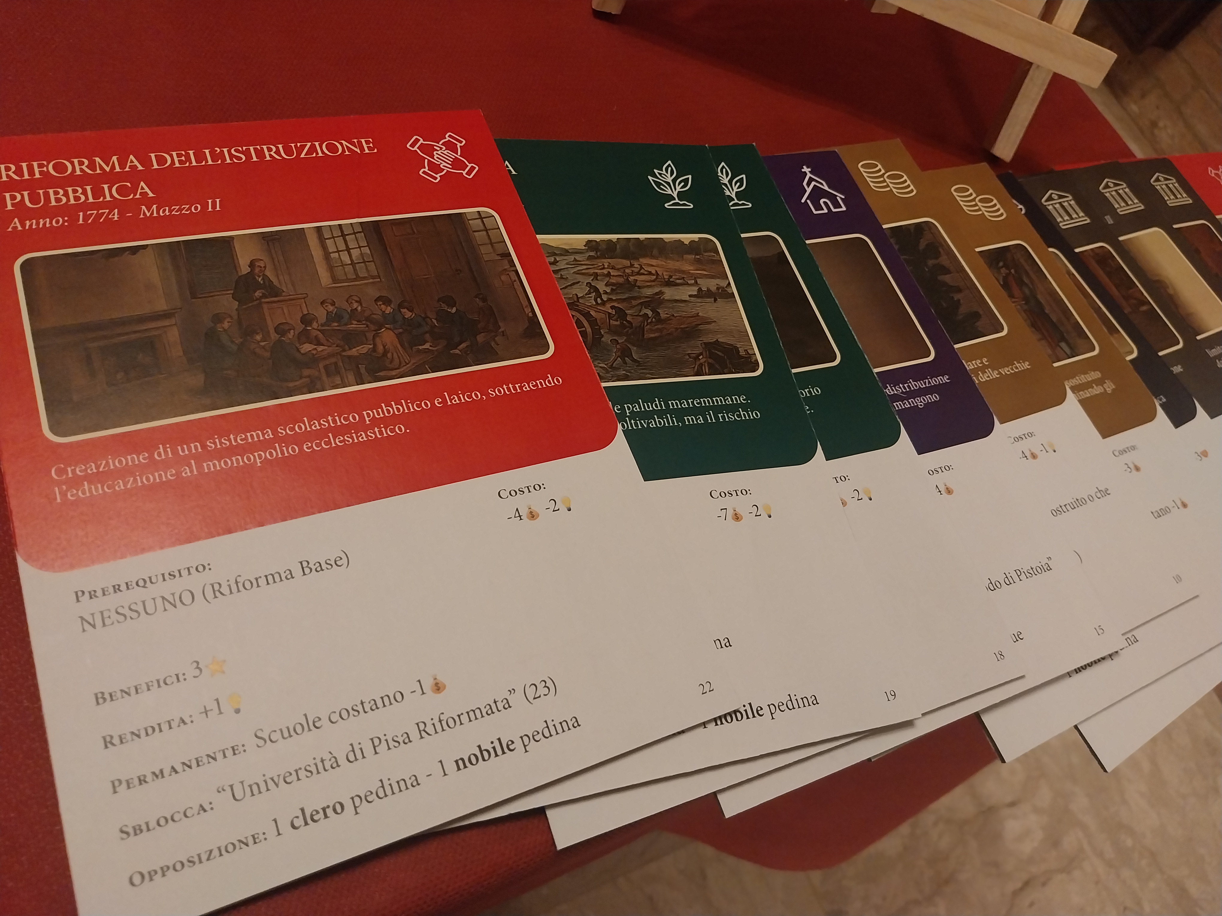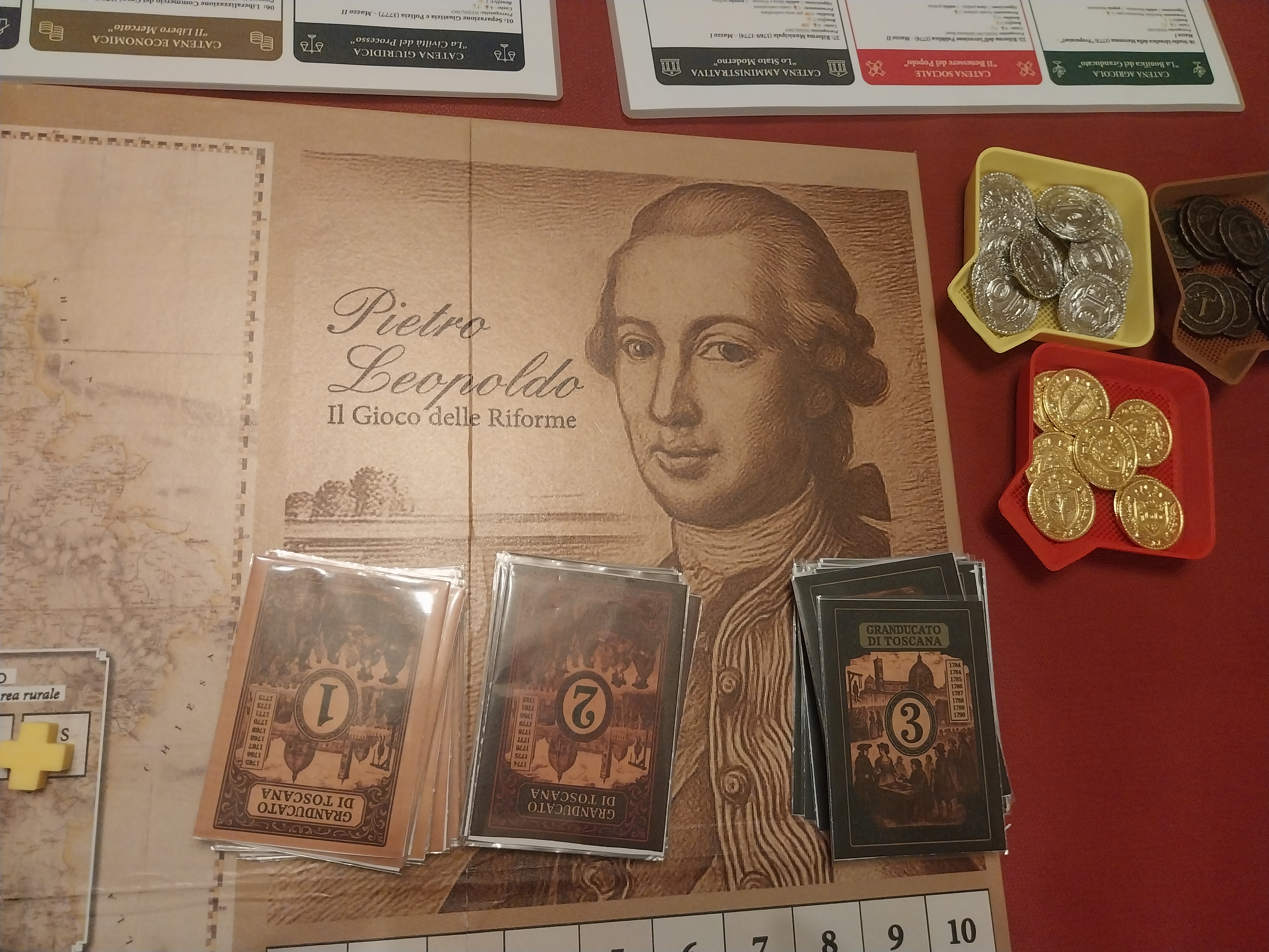 Ed eccoci quindi di fronte al prototipo di un gioco da tavolo dal nome “Pietro Leopoldo, il gioco delle grandi riforme”: un gioco di ruolo e di strategia della durata di circa due ore. Ogni partecipante secondo l’intento dei creatori è portato a rivivere direttamente, e non a subire, la Storia, impersonando uno dei consiglieri del Granduca, realmente esistiti e rappresentati in effige; infatti lo scopo del gioco, attraverso un sistema di carte e tabelloni è proporre ed attuare il maggior numero possibile di riforme in un vero e proprio ambito “politico” che richiede capacità di interazione con gli altri partecipanti e con i rappresentanti delle varie classi sociali (clero, nobiltà, popolo) di cui bisogna ottenere il consenso o gestire l’opposizione. E bisogna anche reperire il denaro necessario…