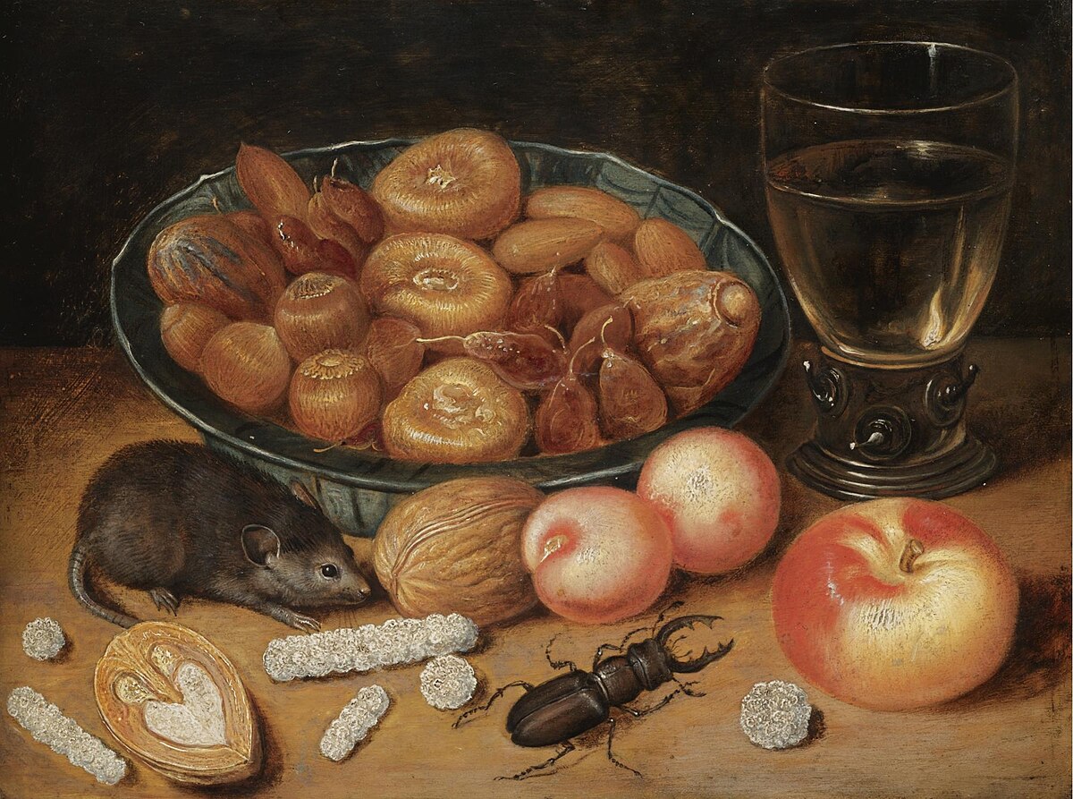 Georg Flegel, "Natura morta con vaso di fiori, noci, frutta e topo" (cr. Sotheby's 2007 Wikimedia commons)