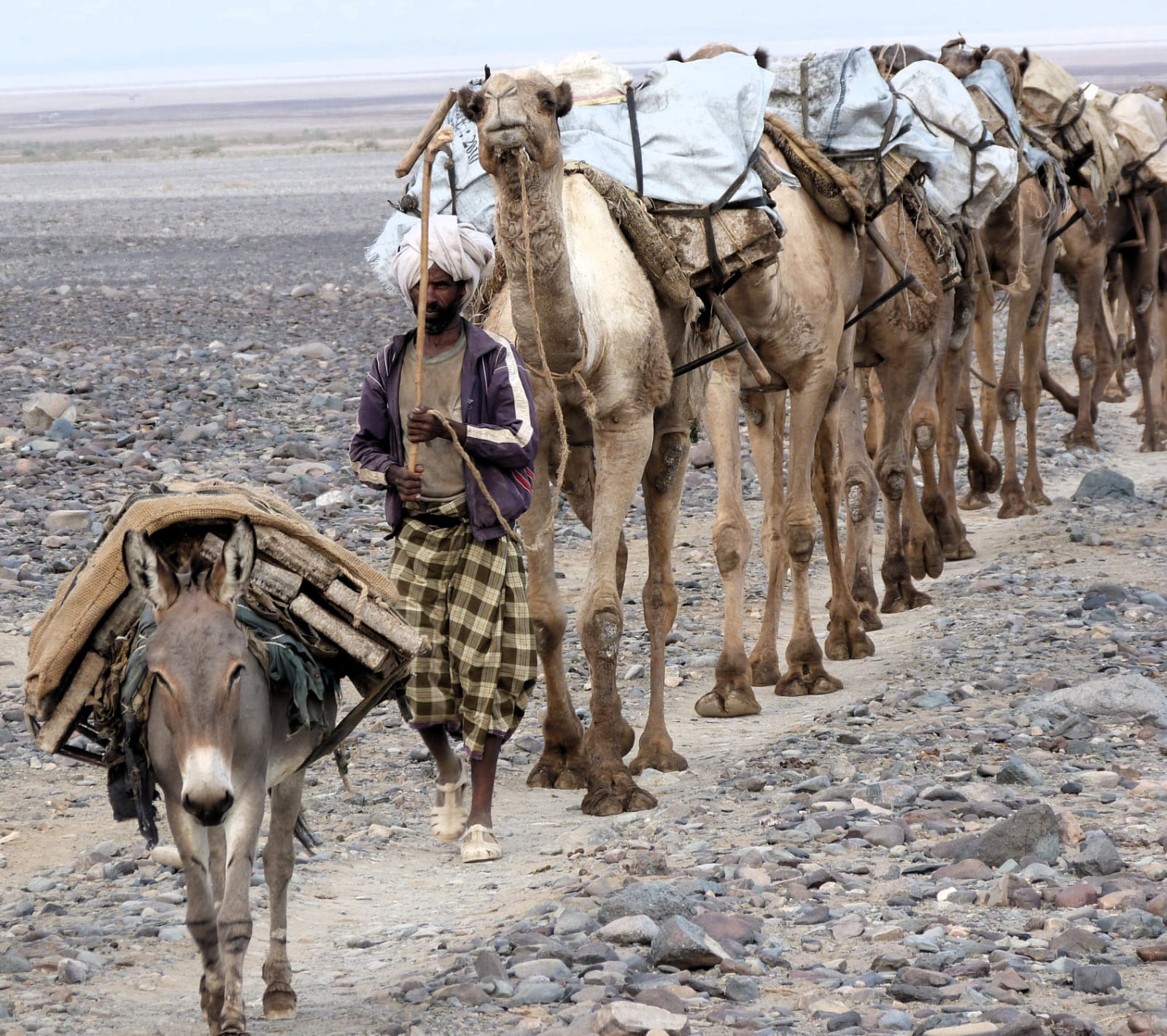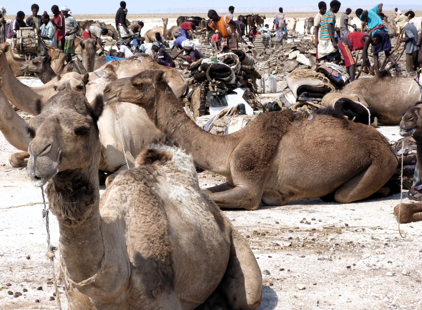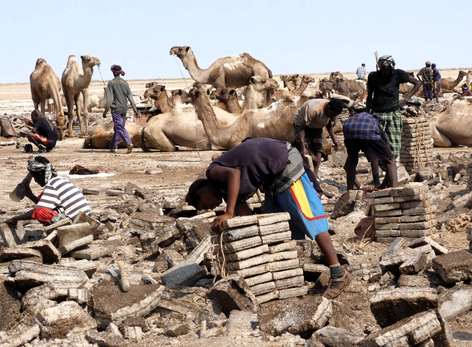A mano a mano che mi avvicino al luogo di estrazione appare evidente la presenza di decine e decine di uomini che, a piedi nudi o con semplici sandali in plastica spaccano il terreno con piccole accette e sollevano blocchi di sale con lunghe pertiche. Accanto a loro altri uomini lavorano per ridurre le lastre irregolari in grosse mattonelle adatte ad essere caricate e poi trasportate a dorso di dromedario. Le carovane del sale prendono forma piano piano e si incamminano verso la regione del Tigray su sentieri secolari in una lunga fila ondeggiante preceduta e accompagnata da carovanieri col caratteristico bastone poggiato sulle spalle.