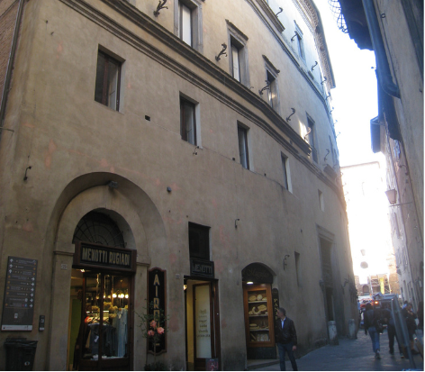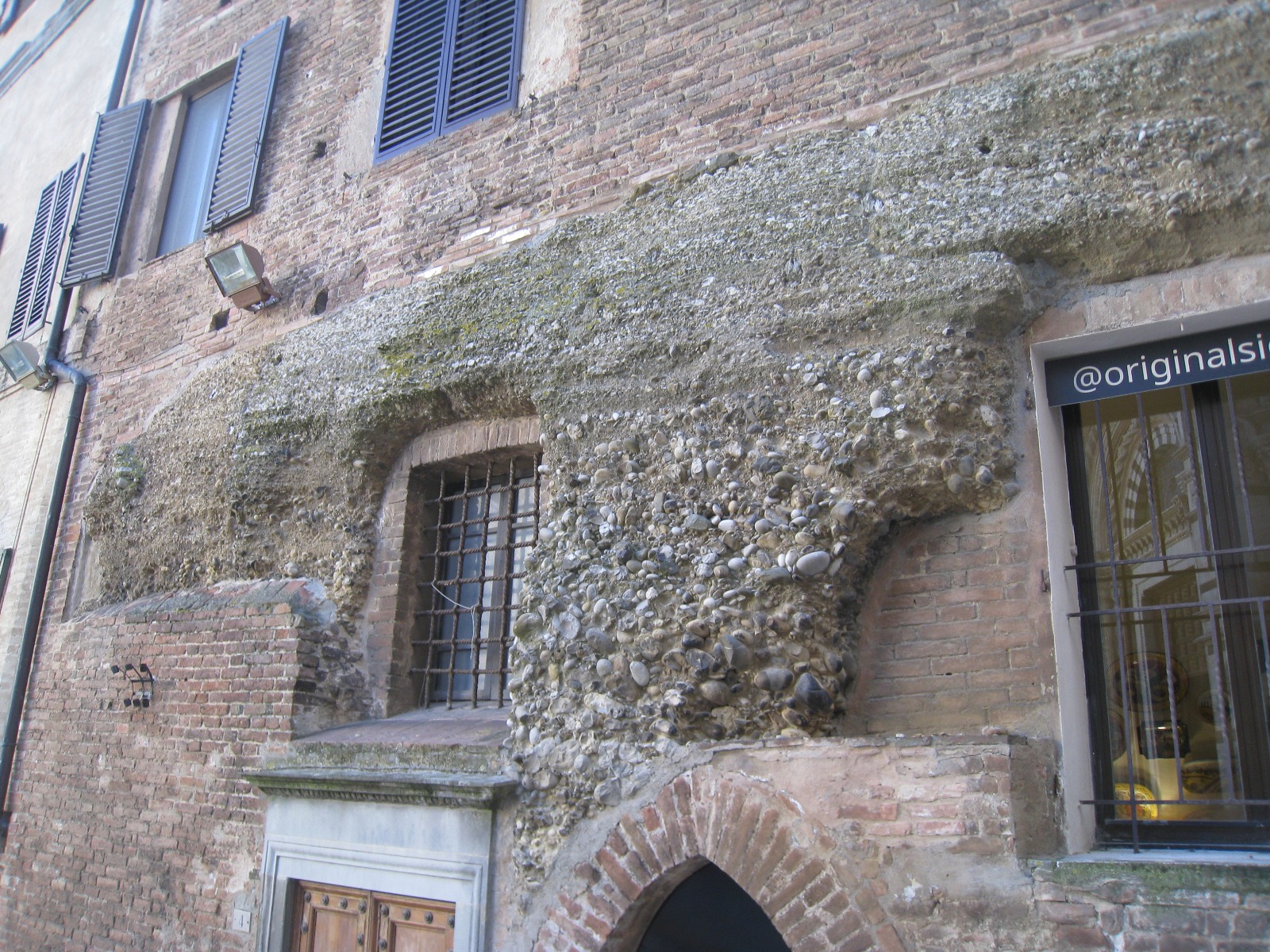La via è spezzata in due dalla sporgenza di un antico palazzo. L’occhio attento nota una roccia inclusa nel muro. I senesi antichi ne hanno sfruttato le cavità sottostanti, vi hanno fondato il palazzo, per poi stendere un tessuto murario uniforme che comprende ma lascia in vista la rupe originaria. Lo stesso fenomeno architettonico è individuabile, in misura anche più imponente, dall’altro lato del costone roccioso, verso il Battistero.